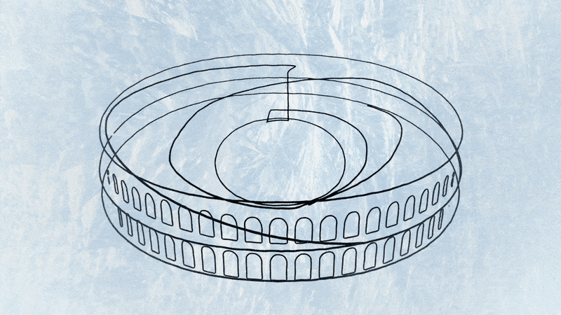 A central space inspired by the original Roman arena where a drop of water falls, expands, and creates dynamic and concentric levels reminiscent of a mountain and of sport achievements.